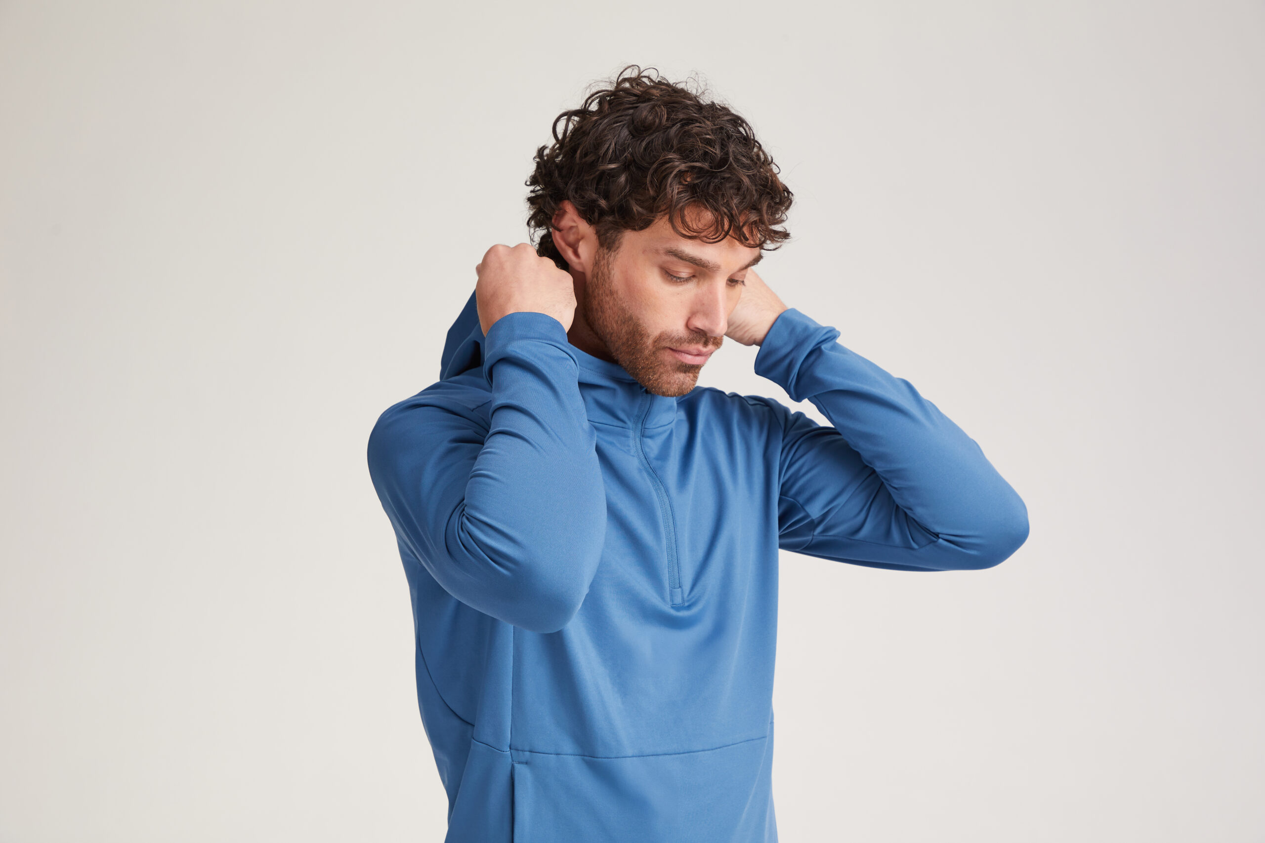• Hooded design with half-zip opening.